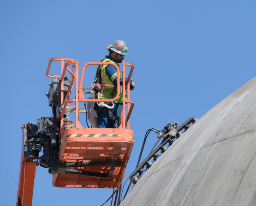 A high pressure water jet cutting system designed to segment large liquid hydrogen Horton spheres (dewars). The system was designed to cope with surface coatings containing PCB, radiologically contaminated structures, elevated work requirements due to vessel heights all within a desert environment with high fire risk.